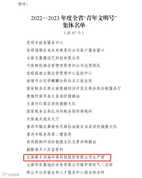 近日,云南顺丰洱海环保科技股份有限公司生产部被共青团云南省委授予2022-2023年度“省级青年文明号”荣誉称号。共青团大理州委书记邓娜、副书记周子楠一行到公司举行了授牌仪式。