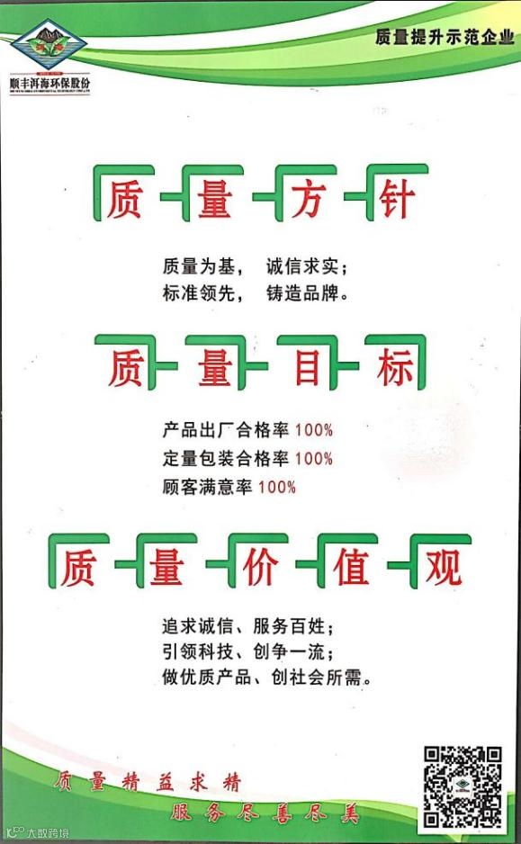 质量是企业长远发展的根本,只有质量搞得好,企业才能枝繁叶茂高质量健康发展。只有产品让客户满意,才能不断提升公司产品质量形象和竞争力。顺丰洱海环保股份将秉承“质量精益求精,服务尽善尽美”的经营宗旨,坚持走专业化、精细化、特色化、创新化的发展之路,以质量取胜,让广大农户“花血汗钱,买放心肥!”