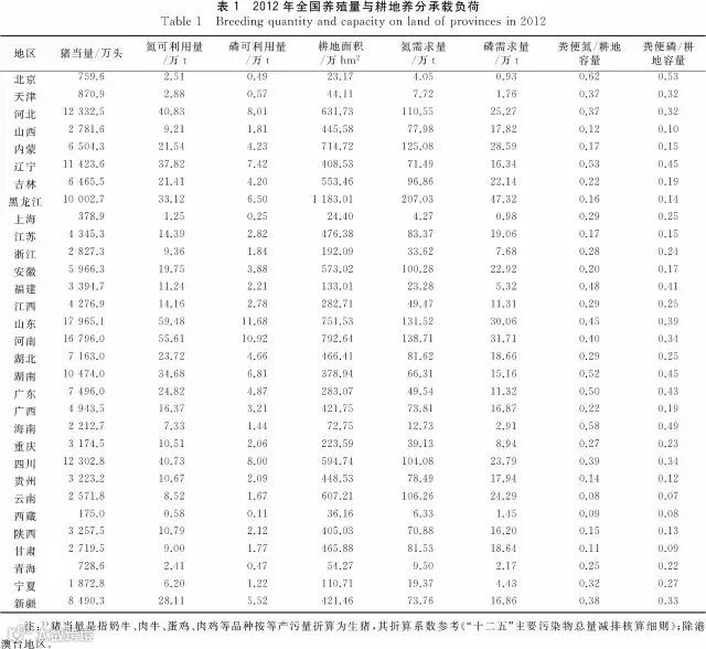 2012年全国养殖量与耕地养分承载负荷见表1。全国粪便氮/耕地容量、粪便磷/耕地容量分别在0.08~0.62、0.07~0.53,各省粪便氮、磷可利用量均远小于耕地养分容量,对于北京这类耕地较为紧缺的区域而言,依然有足够的土地容量来消纳本区域的畜禽粪肥。全国平均而言,粪便可利用氮、磷数量分别占耕地总容量的28%和24%,说明无论从耕地总量或各省耕地数量而言,各区域的粪污养分均在耕地可消纳的范围内。