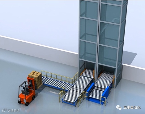 但图五则设备选型比较难,需要将非标准化载具完成标准化搬运需求才能完成系统详细设计。图六左侧的垂直输送机为标准化物料搬运的滚筒输送机效果图;右侧为非标准化物料垂直物流输送机效果图----可参考图七理解如何通过母托盘将非标准化物料实现标准化搬运。