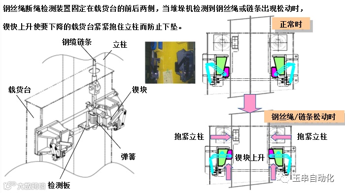 升降驱动装置装有交流电机,通过变频器平稳控制加减速度。在制动方面则采用电磁制动方式,