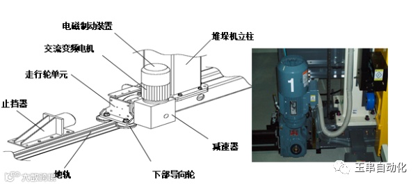 行走驱动装置装有交流电机,通过变频器平稳控制加减速度。在制动方面采用电磁制动方式,当电源完全切断时仍对堆垛机起制动作用。