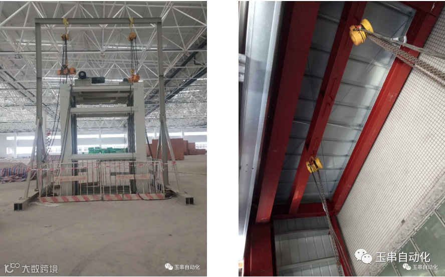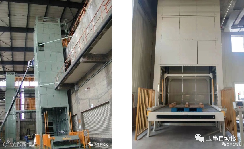 垂直输送机的工艺是由电梯演变而来,行业中依然有利用电梯的建筑结构来规划和实施物流垂直输送机的案例;玉串自动化也尝试过利用原有的电梯结构改造成提升机的案例,其结果是因电梯层门的设计无法实现升降台输送机与楼层水平输送机同步对接,需要轿厢平层(电梯轿厢与抵达楼层楼面持平)后将升降台改造的输送机通过移载装置与楼层水平输送机对接后,方能实现货物的搬入或者搬出的输送作业,因此基于轿厢内外水平输送机平层精度的要求,利用原有电梯结构改造提升机的方案并不算成功,因为轿厢门的开关时间,轿厢内升降水平输送机与楼层水平输送机平层对接时间的浪费,搬运能力相对于电梯而言并不算很理想。