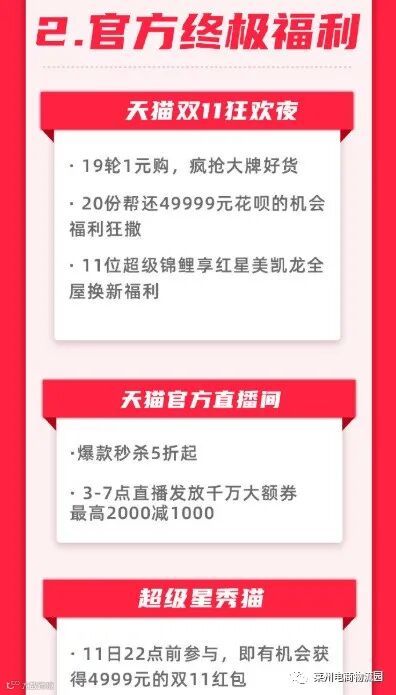 在天猫双11狂欢夜中,天猫官方将开展19轮大牌1元购活动,向用户发放20份帮换49999元花呗的机会,此外,天猫还将抽出11位超级锦鲤送出红心美凯龙全屋换新福利。