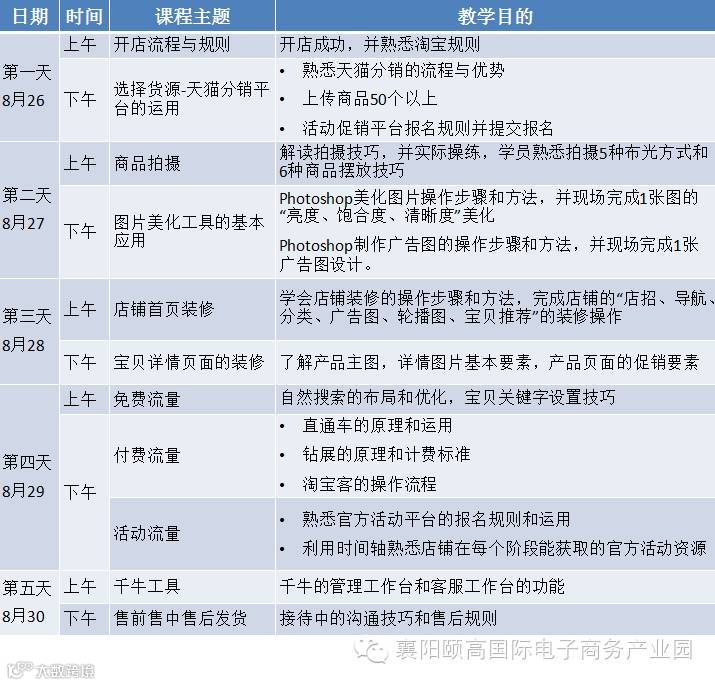 培训费用:5天总费用800元/人(入驻颐高国际商贸城的商家免收培训费用)