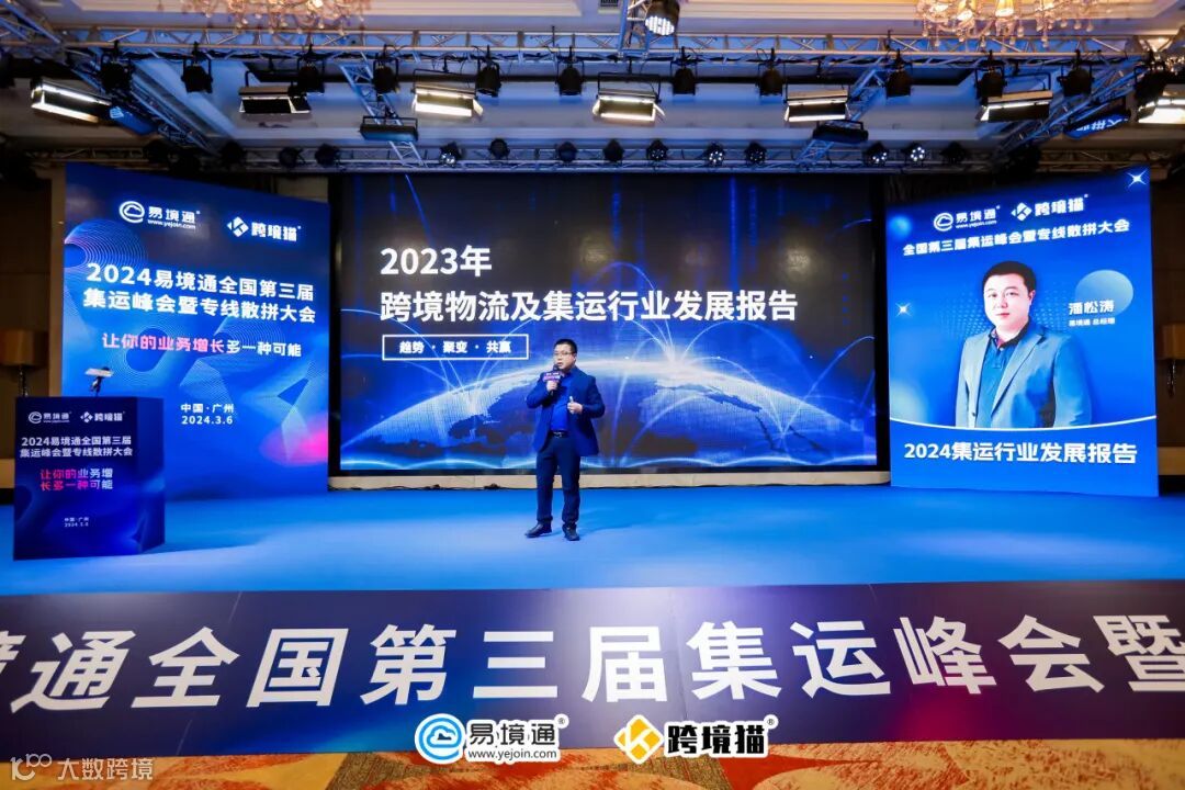 首先,由易境通总经理潘松涛先生发表了题为《2024集运行业发展报告》的演讲,为集运行业的同仁们带来了深刻的思考与前瞻性的指导。他凭借2023年的市场数据,全面剖析了行业的当前状况,并对行业未来的发展趋势和潜在增长点进行了精准预测。这份报告不仅展现了深厚的行业洞察力,更揭示了集运行业的未来增长契机与创新的营销策略,为行业的未来发展提供了极具价值的参考与启示,引发了现场与会者的热烈反响与深度思考。
