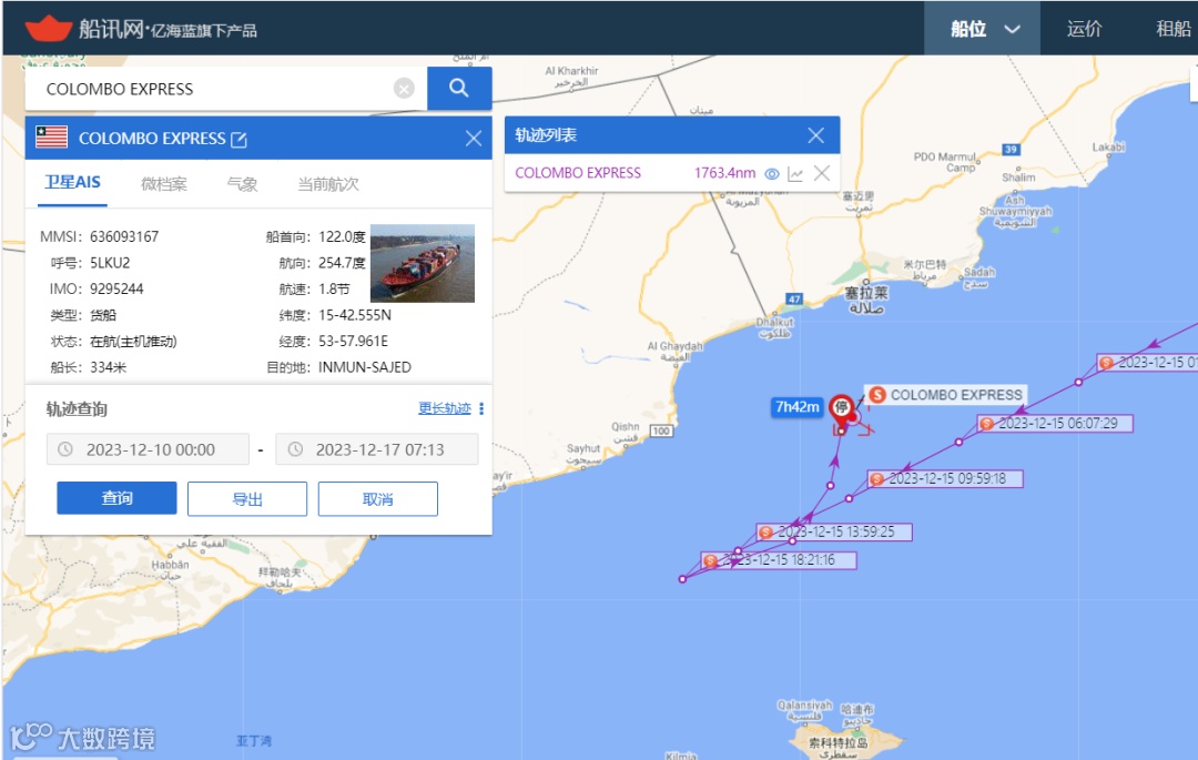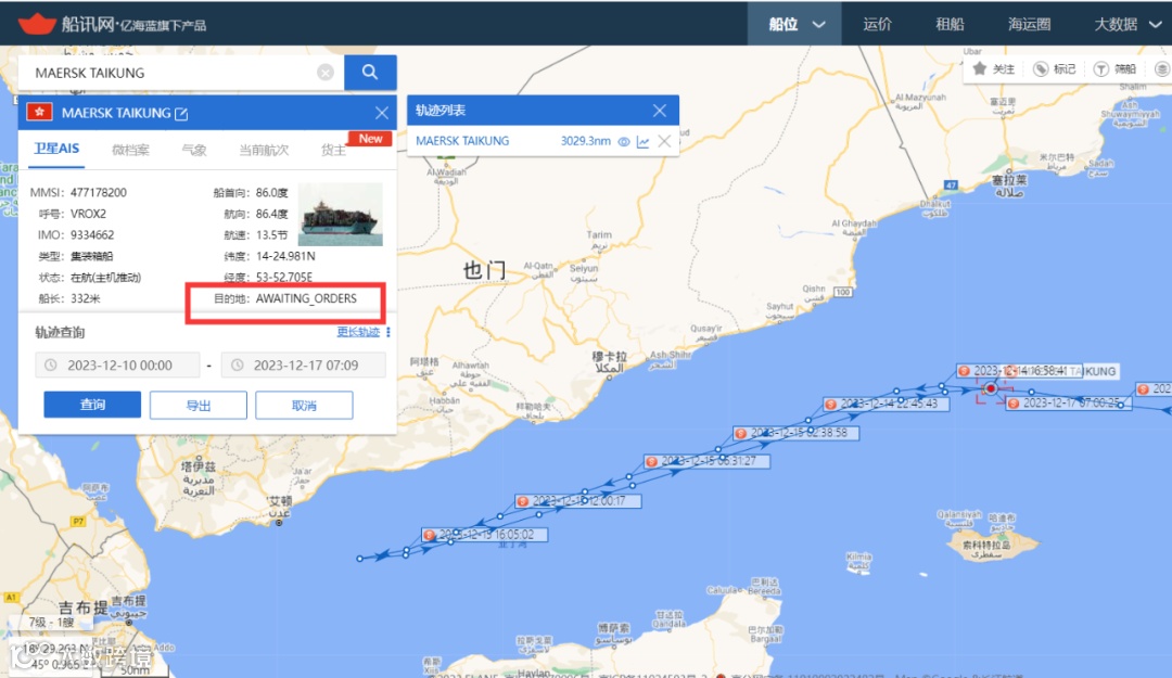 马士基旗下一艘名为Maersk Tikung(8112TEU) 的集装箱船在即将抵达曼德海峡前在亚丁湾紧急掉头,目前仍在一13.5节左右的速度在向东航行,AIS状态显示为“等待进一步指令”,如下: