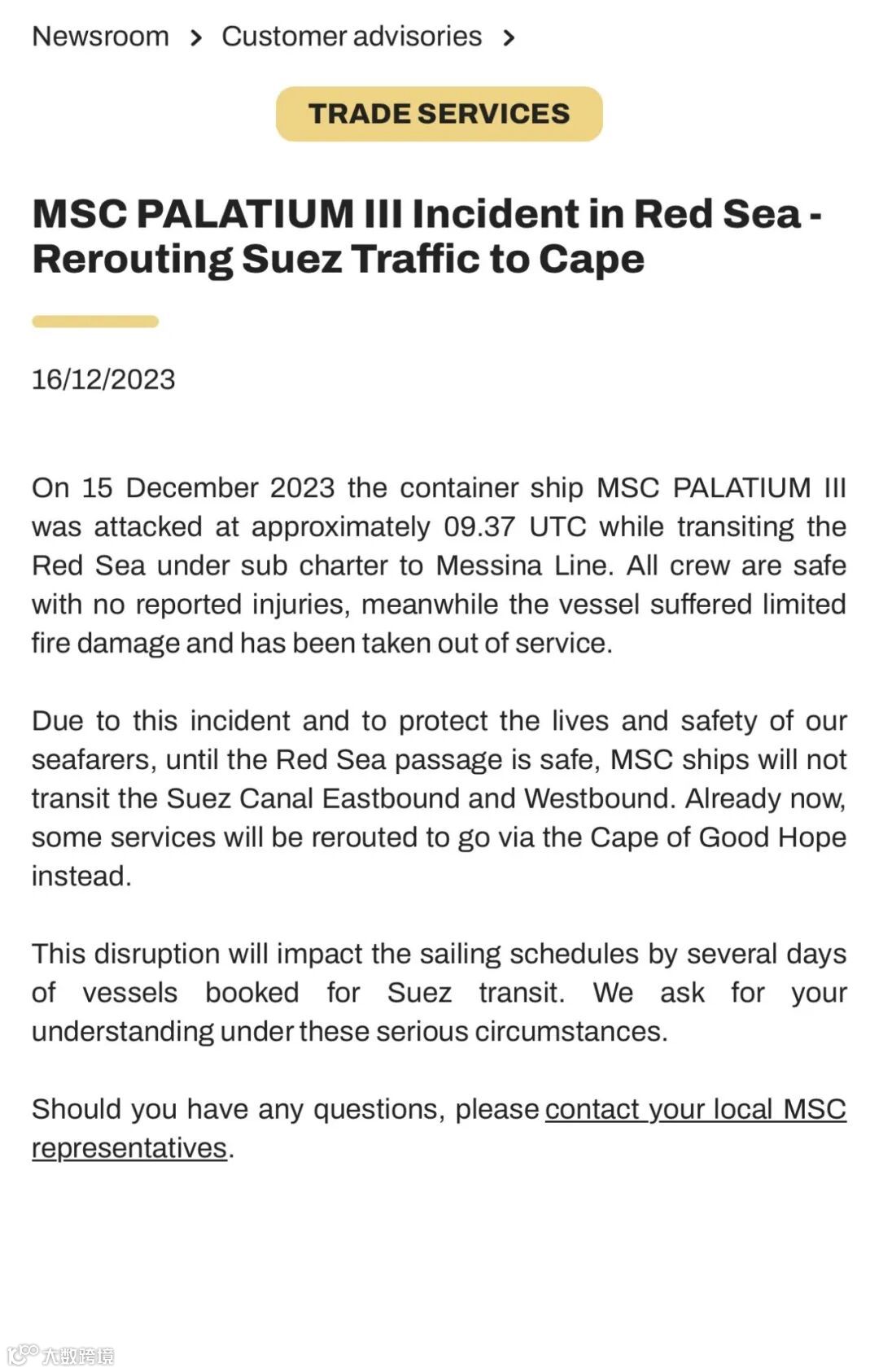 此外,MSC方面还透露,该公司旗下一些航线的船舶将开始绕航好望角。