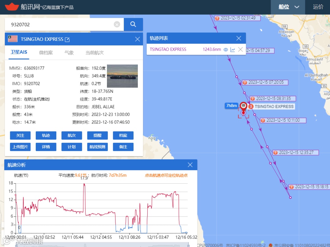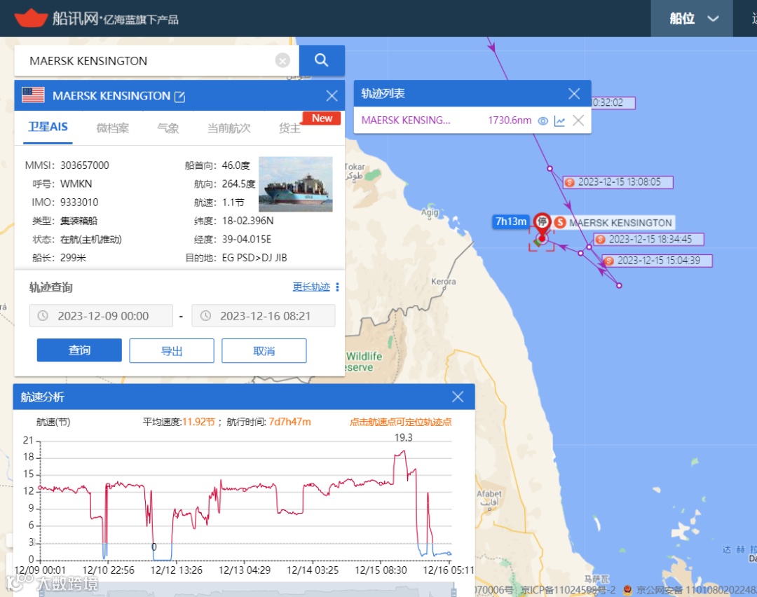 另一艘 6,200 TEU的 Maersk Chicago轮也在亚丁湾紧急返航,虽然其AIS信息的目的地仍然显示为苏伊士运河,但目前该轮仍在以14.5节左右的速度向东航行。如下: