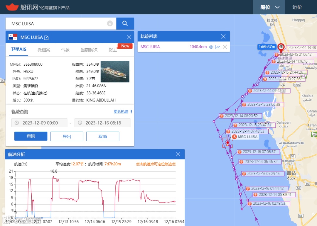 MSC旗下的一艘名为MSC Luisa的集装箱船也在红海水域紧急掉头,如下: