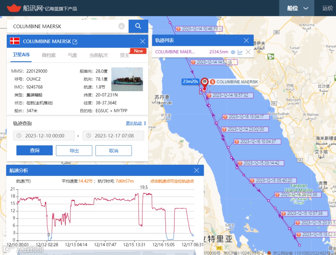 如信德海事网昨天在《重大突发!多船紧急返航!马士基+赫伯罗特紧急暂停红海航线》一文中介绍到,根据船讯网为信德海事网提供的卫星AIS信息显示,目前马士基旗下经营的一艘名为 Colombine Maersk(8648TEU)的集装箱船在红海海域180度大转弯,紧急掉头,目前该轮已经航行至苏丹港附近海域处于漂航等待指令状态,该轮原本计划从苏伊士运河前往马来西亚。如下: