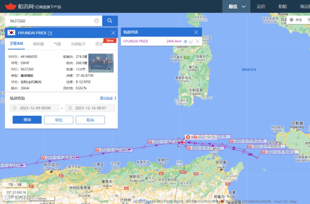 更值得一提的是,信德海事网还发现与赫伯罗特同属一个联盟的HMM旗下一艘名为HYNDAI PRIDE的大型集装箱船(13154TEU)也在地中海内突然转向,看样子可能是要再次穿过直布罗陀海峡进入大西洋绕航好望角。如下: