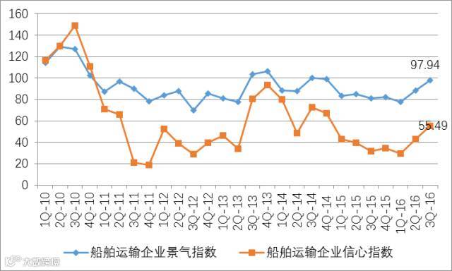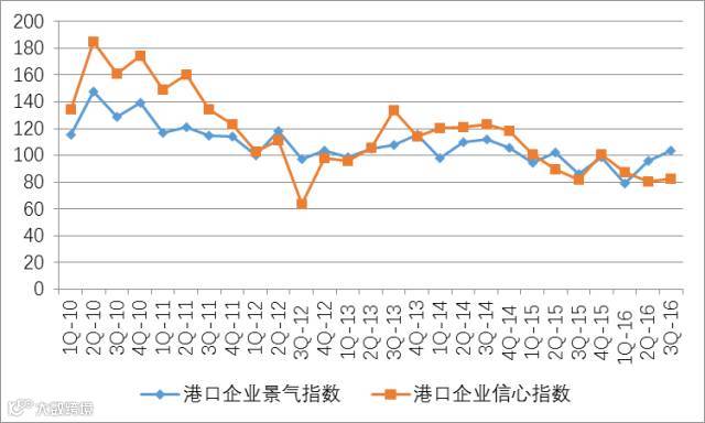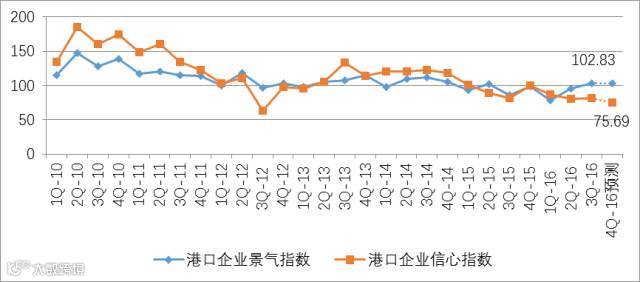 根据中国航运景气调查显示,2016年第四季度,中国港口企业景气指数预计为102.83点,仍处于景气区间。中国港口企业吞吐量、泊位利用率、盈利状况与流动资金等重要经营指标仍旧向好,但是向好的强度出现一定的弱化迹象。受此影响,中国港口企业信心指数预计为75.69点,下挫至较为不景气区间。