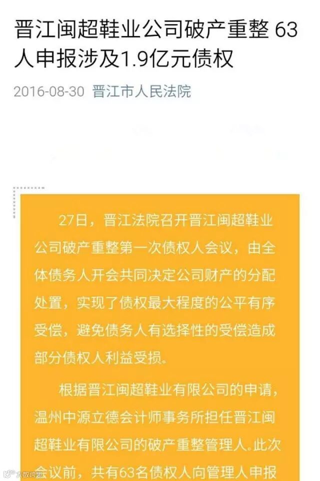 根据晋江闽超鞋业有限公司的申请,温州中源立德会计师事务所担任晋江闽超鞋业有限公司的破产重整管理人。此次会议前,共有63名债权人向管理人申报债权,债权总额1.9亿元。会议实到债权人55人,占债权人总人数的87%,债权额占无担保债权的97.2%。管理人在会议上汇报了债权审核情况、清产核资状况。债权人选举产生了五名债委会委员,负责监督破产企业的财产管理和分配。