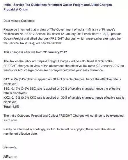 近日,印度出台了一项奇葩新政,1月22日起,所有出口至该国的CIF类货物,将在原来的运费基础上额外征收4.5%的服务税!