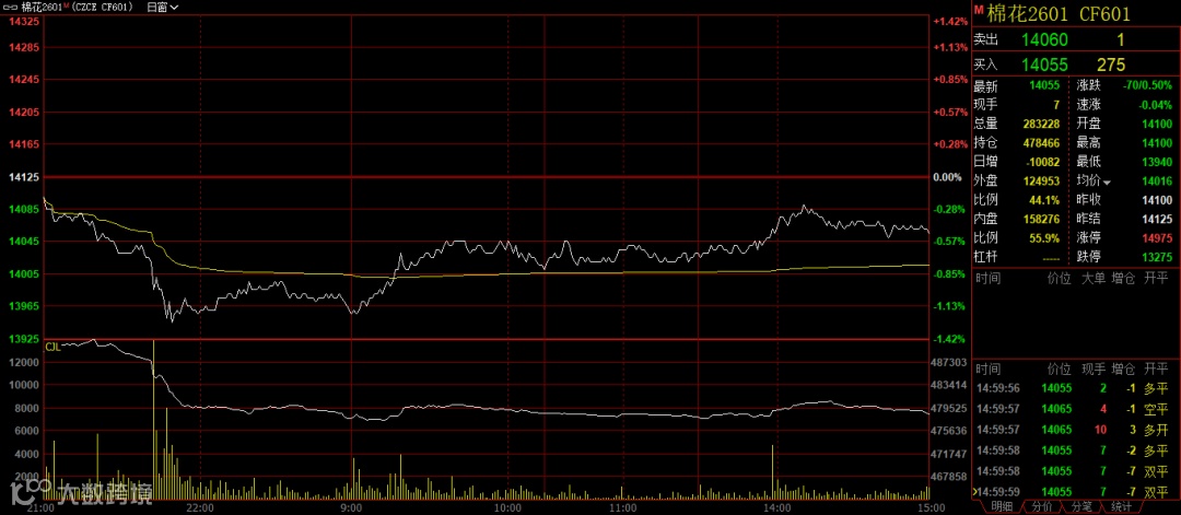旧作库存逐渐消耗,但下游订单偏弱和新棉增产预期施压,郑棉期货震荡偏弱运行,主力2601合约夜盘大幅回调,跌破万四整数关口,触及逾1周低点13940元,日内交投重心逐渐回升,重回万四关口上方,但至收盘处未能扭转跌势,下滑0.5%。