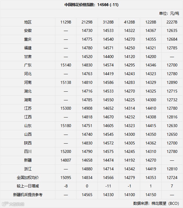 中国棉花价格指数发布三个代表品种CC Index3128B、CC Index2129B、CC Index2227B,分别代表国内棉花现货的“高、中、低”等级的实际到厂成交价。其中CC Index3128B是白棉3级、长度28毫米、马克隆值B级代表标准级(中等级)棉花;CC Index2129B为白棉2级、长度29毫米、马克隆值B级,代表高等级的棉花;CC Index2227B为淡点污棉2级、长度27毫米、马克隆值B级,代表低等级的棉花。发布三个代表品种的同时还发布1129B、1228B、4128B的价格以及分省数据。新标准下中国棉花价格指数发布的价格,除颜色级、长度级和马克隆值级外,其它指标限定为长度整齐度中等、断裂比强度中等、轧工质量中等、异性纤维含量低。