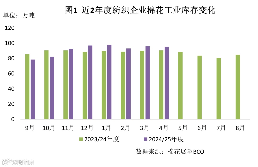 月内棉花价格承压下跌,部分企业低位适当补库,然而关税风险下企业信心不足,总体原料库存稳中略降。据调查,截至4月底纺织企业在库棉花工业库存量为95.4万吨,环比减少0.5万吨。其中:27%的企业增加棉花库存,30%减少库存,43%基本保持不变。