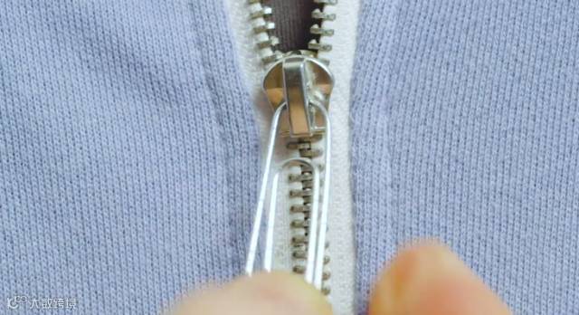 金属的拉链用久之后,拉头便会松动,口径随之变大,就不好拉上了。用镊子夹住拉头的尾部,将其夹紧,不要太用力,夹断了就不好了。