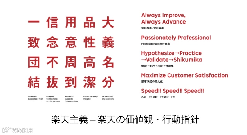 这25个字,从中文的字面意思就能理解。乐天内部把它称之为”乐天主义“。我们不知道在乐天的内部员工培训里,会不会把这些价值观详细拆解培训。或者犹如阿里巴巴那样把价值观纳入KPI考核体系?或许,以日本人的职业精神,可能就是默默的灌输在日常工作中吧。