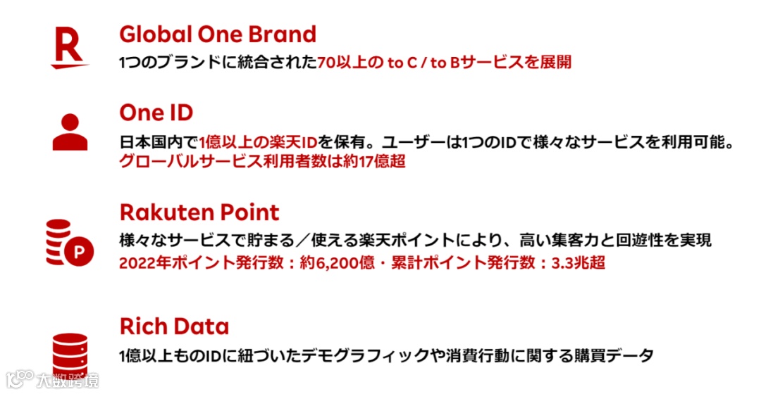 时至今日,乐天又一次升级了集团战略。主打的就是"同一个品牌、同一个ID"。乐天希望可以在全球统一使用乐天品牌进行业务开展,增强用户认知;同时,活用乐天的注册ID,从技术底层打通所有集团业务,该ID可以在乐天所打造的业务圈里自由活动,把用户牢牢捆在乐天生态里;同时,用积分和大数据,针对用户行为推出匹配服务。
