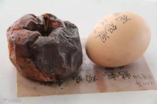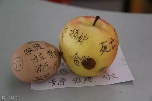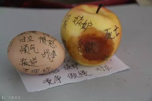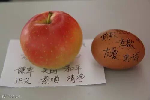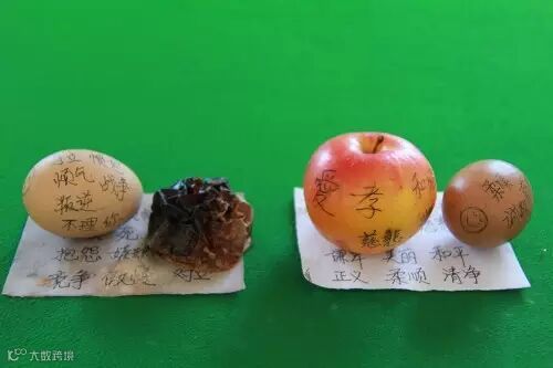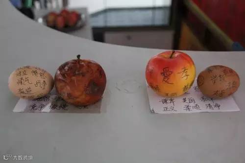 7周后镜头特写;增添美好文字的苹果还是那么完整,(实验过程中为了避免干扰,苹果和鸡蛋是锁在房间里面的。)