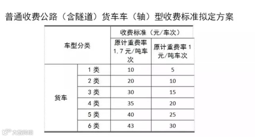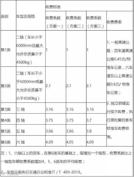 各类货车收费标准根据现行标准平移,不高于现行最高收费标准。1类、2类货车执行现行收费标准;5类(轴)、6类(轴)执行现行5类货车收费标准;3类、4类货车收费标准按载质量分布合理确定。