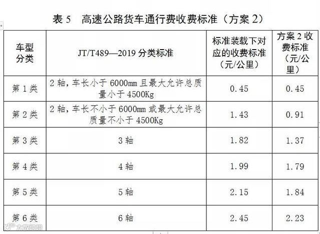 一级收费公路方面,将按照一级收费公路1~6类货车标准装载状态下的计重收费标准,转换为对应的车型收费标准。