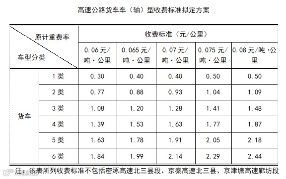 除以上3条段高速公路外,省高速公路当前执行的货车计重收费基本费率共5个档次,分别为0.06元/吨公里、0.065元/吨公里、0.07元/吨公里、0.075元/吨公里、0.08元/吨公里,调整计费方式后,仍维持5档收费标准。