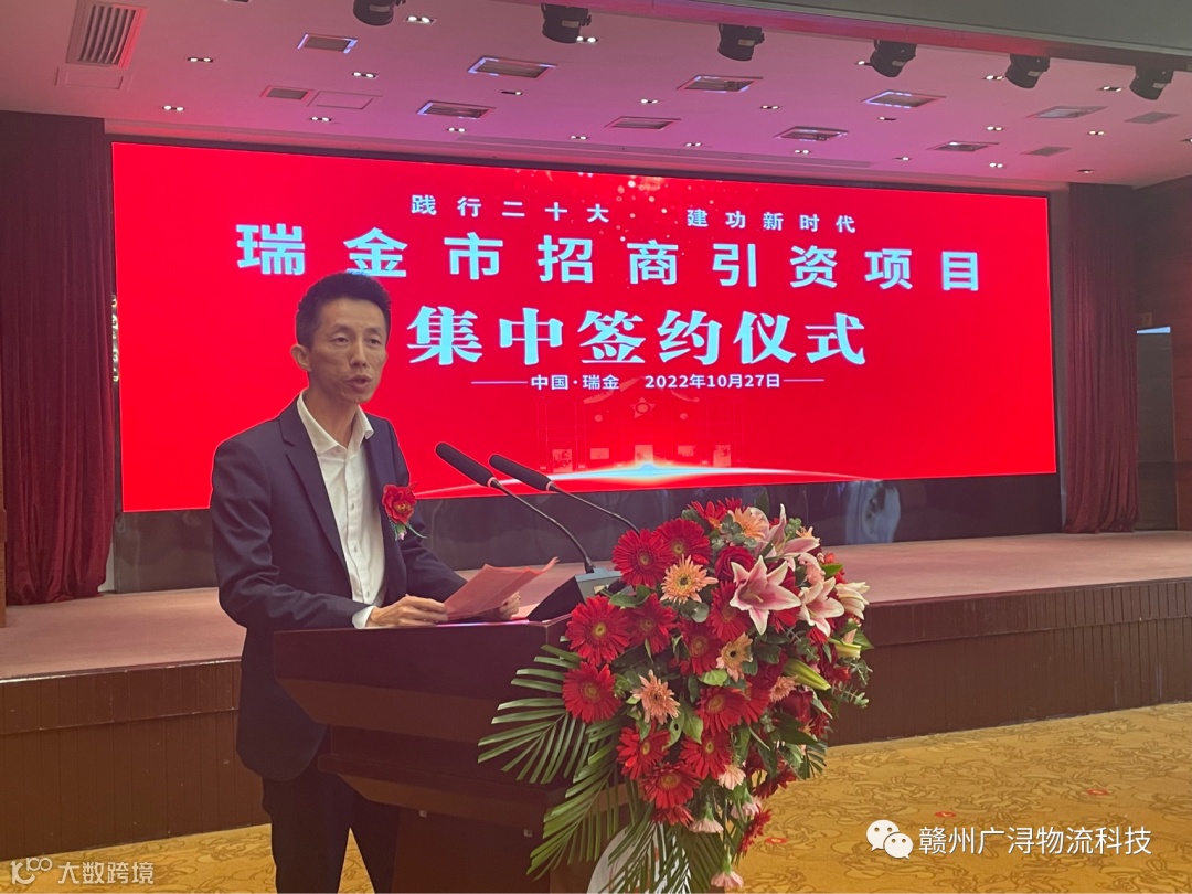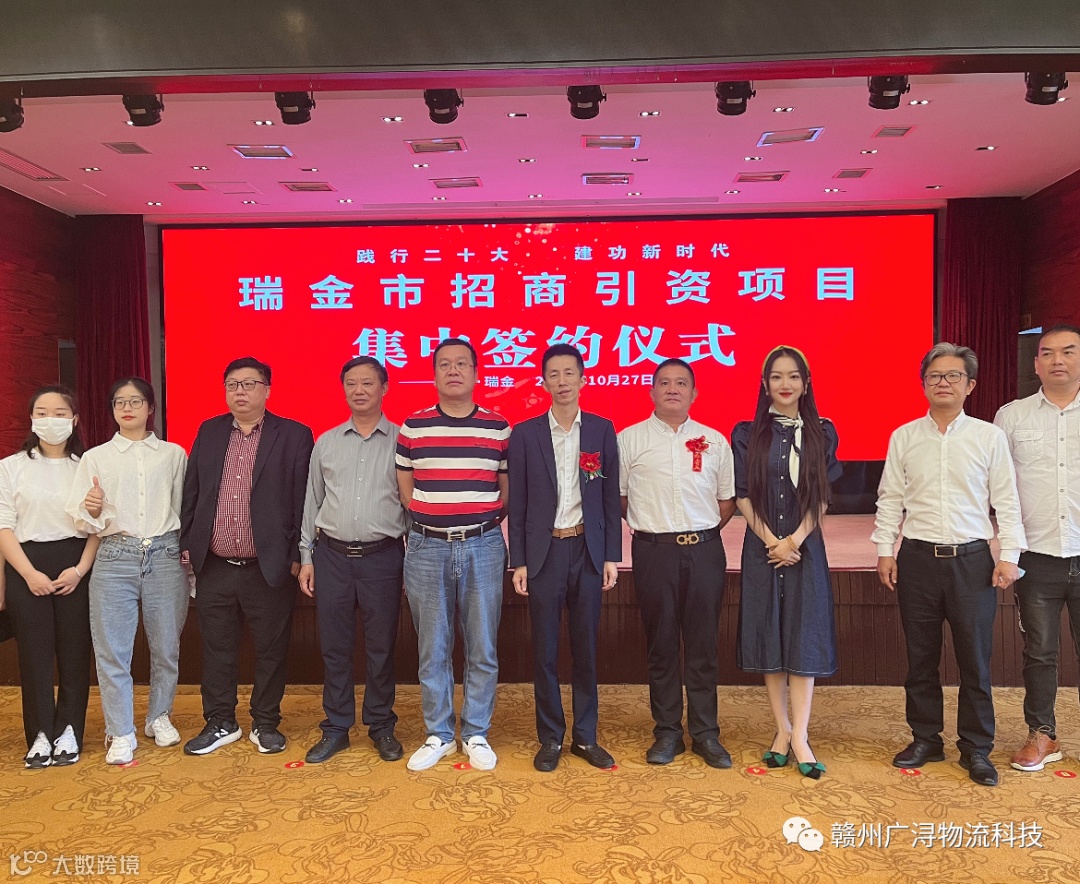 2022年10月27日,江西省瑞金市举行招商引资项目集中签约仪式。江西省赣州市人大常委会副主任,瑞金市委书记尹忠,瑞金市委常委、市政府副市长、瑞金经开区党工委副书记罗林生,瑞金市委常委、市政府常务副市长、党组副书记李鑫,副市长黄发亮等各级领导出席活动并见证项目签约。赣州广浔物流科技有限公司董事长陈爱松及公司高管一行出席签约仪式。