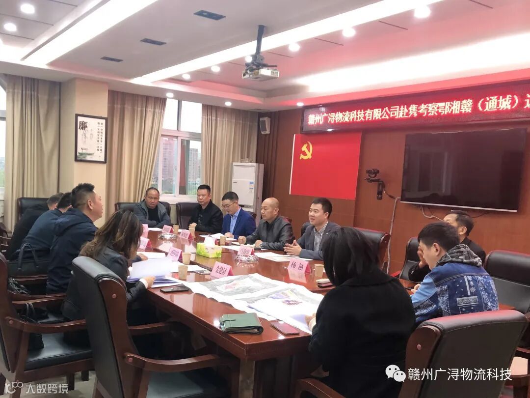 2023年4月24日,赣州广浔物流科技有限公司高管伍海湃一行前往湖北省通城县对接智慧物流园项目;通城县交通运输局副局长刘传国、县投促中心副主任金楚舒、县物流局局长胡雄斌、交通运输局总工程师刘国富等相关负责人与广浔物流团队进行了座谈会议。