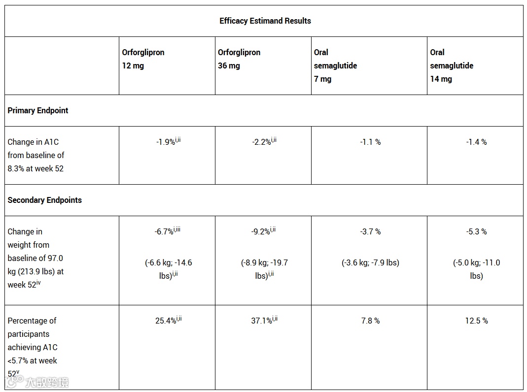 分析显示,orforglipron达到主要终点,显示出相对于活性对照药物的优效性。第52周时,接受12 mg、36 mg orforglipron治疗患者的A1C水平分别平均降低1.9个百分点与2.2个百分点;而接受7 mg与14 mg活性对照药物患者的A1C则分别降低1.1个百分点与1.4个百分点。在一项次要终点中,最高剂量orforglipron组有37.1%的受试者达到A1C小于5.7个百分点,而最高剂量活性对照药物组则仅有12.5%患者达成该指标。