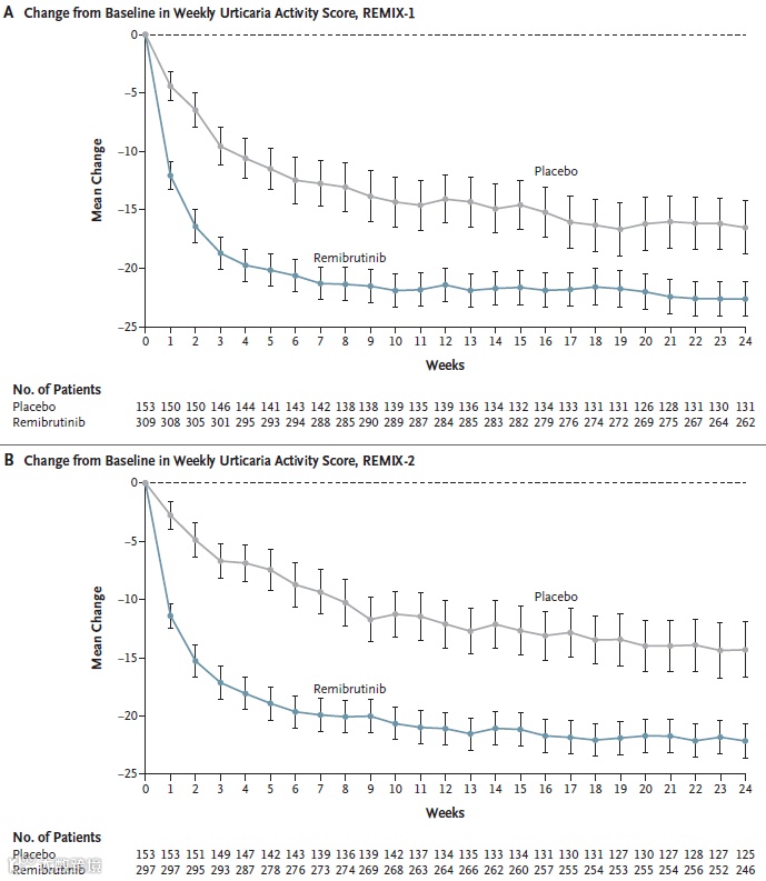 REMIX-2试验:瑞米布替尼组和安慰剂组UAS7评分分别降低19.4分和11.7分(P<0.001)