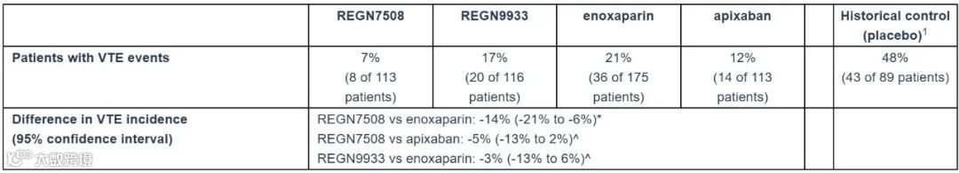 在术后静脉造影检测VTE发生率这一指标上,结合两项试验数据的综合分析显示,REGN7508和REGN9933均达到与活性对照相比的非劣效性标准,具体试验结果如下:
