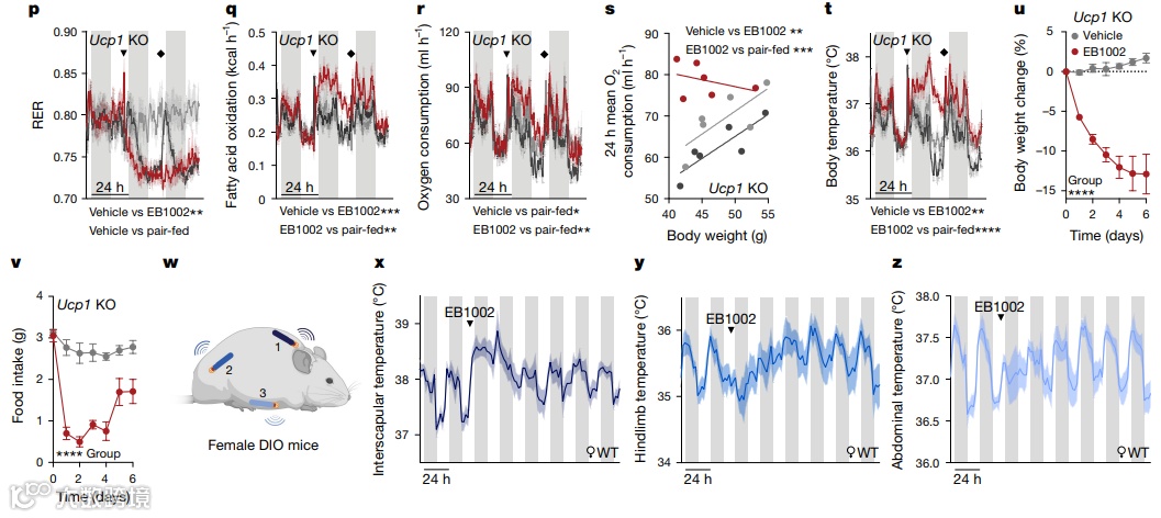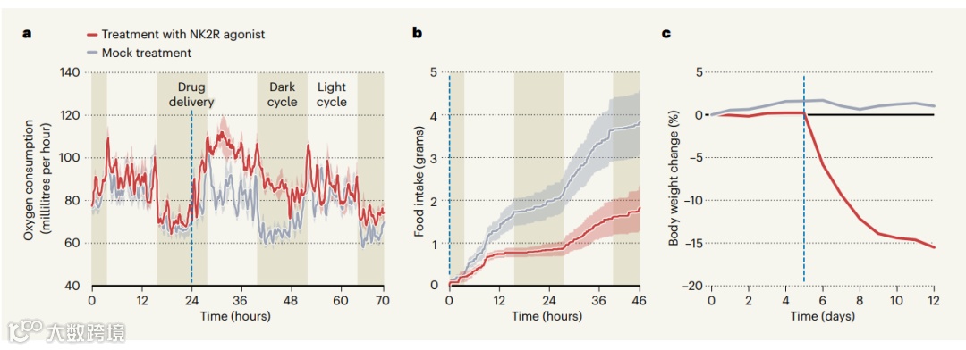 这也让他们对这一分子产生了巨大兴趣。与NK2R相关的分子是否与GLP-1一样,不仅与糖尿病有关,还具有治疗肥胖的潜力呢?一开始,研究者尝试给肥胖小鼠注射了神经激肽A,这是NK2R的一种天然配体。结果非常乐观,这些肥胖小鼠的体重显著减轻了,并且分析显示小鼠的能量消耗有着明显提升。当然,天然配体在体内消失的速度太快,难以发挥“一次注射,长期减重”的效果。