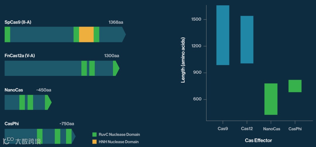 ▲Mammoth的超紧凑核酸酶尺寸与传统CRISPR系统比较(图片来源:Mammoth Biosciences公司官网)