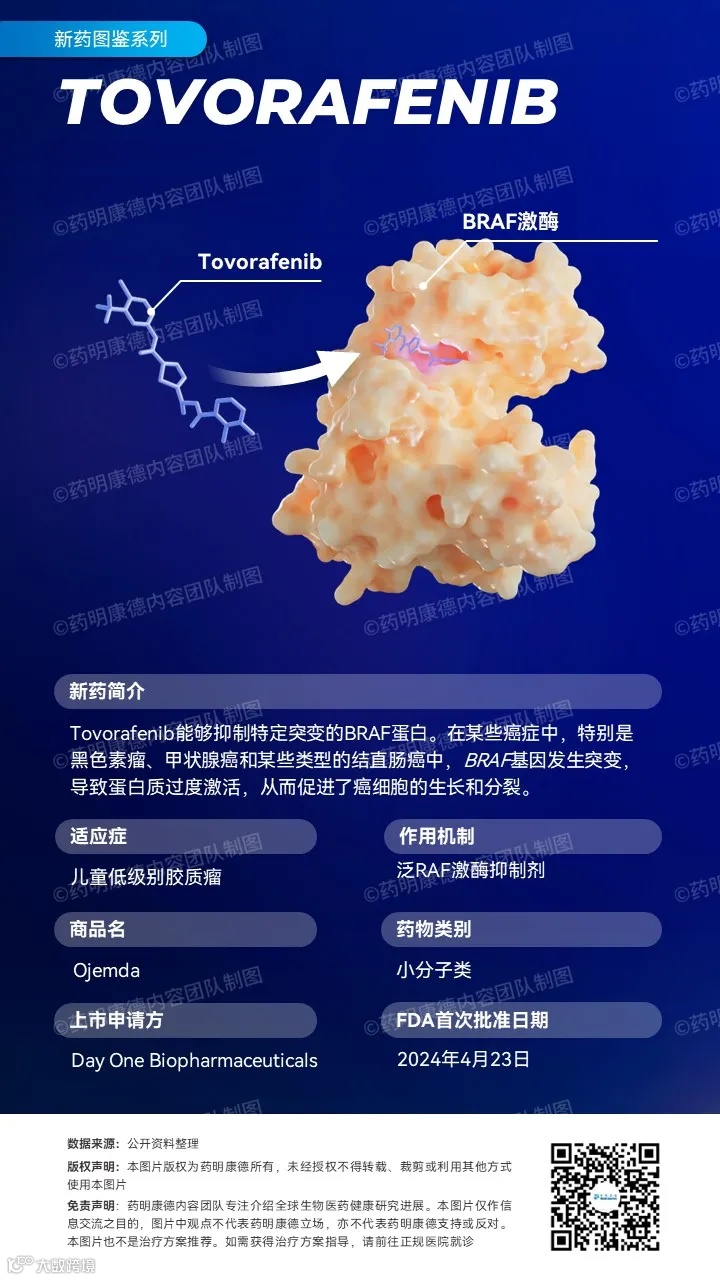 Toverafenib是一款具有大脑渗透性的RAF激酶抑制剂,在今年4月获得美国FDA加速批准(商品名为Ojemda),用于治疗6个月及以上的复发或难治性儿童低级别胶质瘤(pLGG)患者。这些患者携带BRAF融合或重排,或BRAF V600突变。根据美国FDA的新闻稿,这是FDA首次批准一种全身疗法,用于治疗携带BRAF重排(包括融合)变异的儿童低级别胶质瘤患者。Tovorafenib曾获得美国FDA授予的突破性疗法认定和罕见儿科疾病资格,用于治疗携带激活性RAF变异的pLGG。