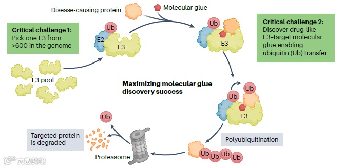 然而,开发创新的分子胶降解剂面临着不少挑战。首先,分子胶降解剂的初步筛选必须在细胞环境中完成,这不仅提高了成本、增加了时间消耗,还需要大量的后期验证工作。人体内存在600多种E3连接酶,从中挑选出适合降解特定目标蛋白的连接酶颇具挑战性,尤其是考虑到科学家对这些连接酶中的仅20-30种有较深入的生物学理解,这为发现新的分子胶增加了难度。此外,找到能够促使E3连接酶与目标蛋白互动的小分子的几率较低,并且目前对分子胶的一般化学特性的了解尚浅,这些因素均提高了化合物库筛选的复杂性,通常需要依赖大型的化合物库才有可能找到合适分子。