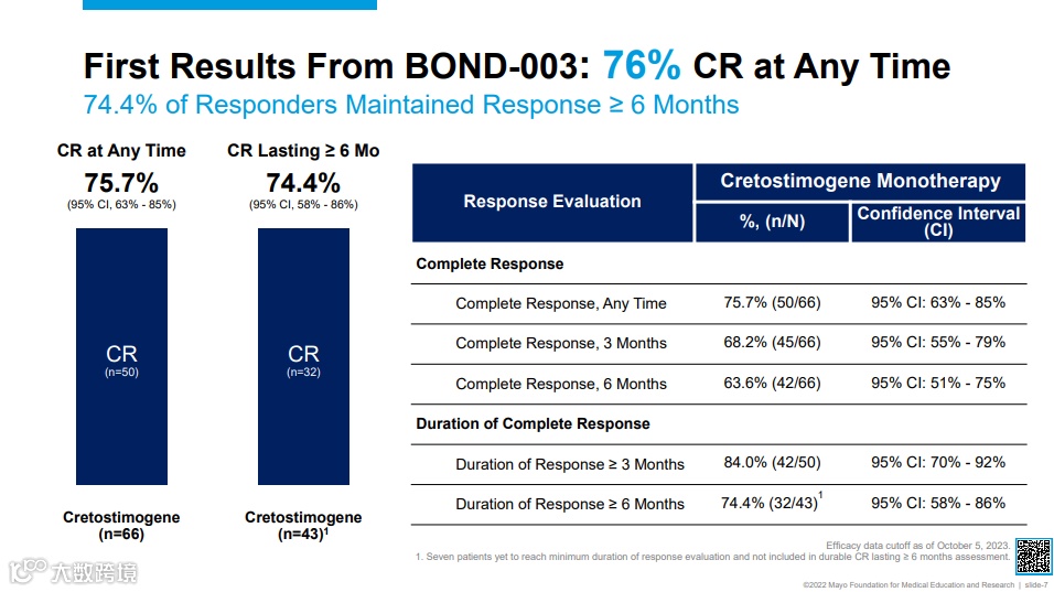 [2] First Results from BOND-003: Phase 3 Study of Cretostimogene Grenadenorepvec Monotherapy for Patients with BCG[1]Unresponsive High-Risk NMIBC with CIS +/- Papillary (Ta/T1) Tumors. Retrieved December 6, 2023 from https://cgoncology.com/wp-content/uploads/2023/10/SUO_2023_First_Results_from_BOND-003.pdf