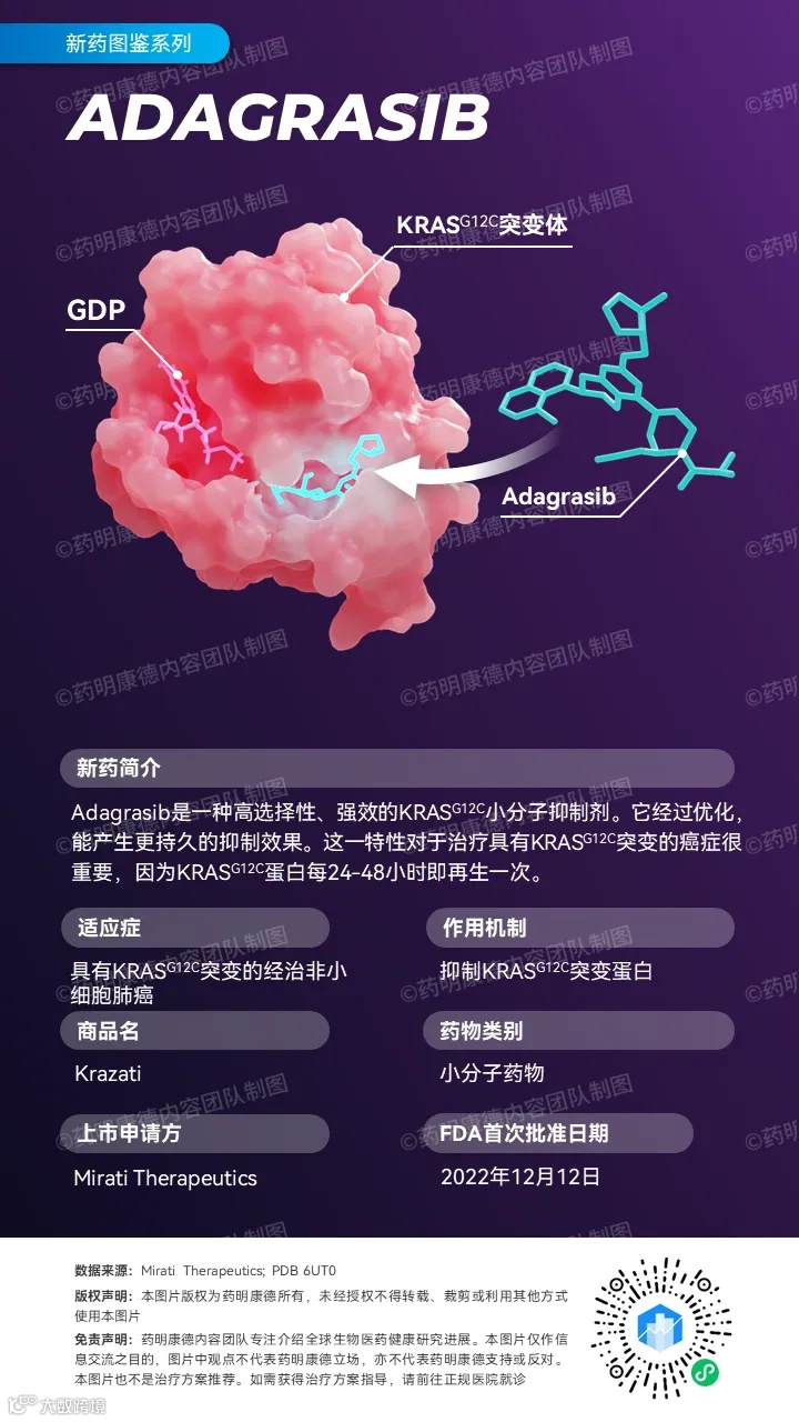 Krazati是一款具有高度特异性的强力口服KRAS G12C抑制剂,经过优化设计具有持久的靶点抑制能力。Krazati具有长达24小时的半衰期和广泛的组织分布,而且能够穿过血脑屏障,有助于最大限度地发挥药物效力。2021年6月,美国FDA授予它突破性疗法认定,并在2022年12月获FDA加速批准上市,用于治疗携带KRAS G12C突变的经治非小细胞肺癌患者。Krazati最初由Mirati Therapeutics所开发,去年10月百时美施贵宝以48亿美元款项收购Mirati,同时囊获此款疗法。再鼎医药则拥有Krazati在大中华区的研究、开发、生产及独家商业权利。
