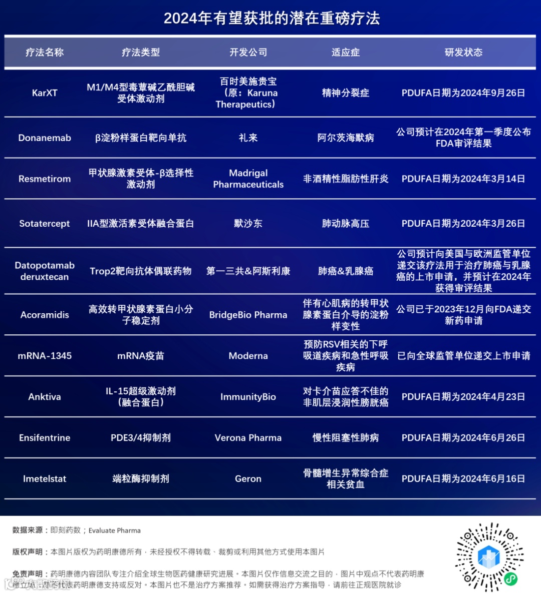 近日,行业媒体Evaluate Pharma针对2024年生物医药产业趋势发布了一项分析报告,其中便对2024年可能获批上市的关键疗法进行报道。今天药明康德内容团队将就此报告内容并结合公开资料,向读者介绍这些有望在今年获批的潜在重磅疗法。