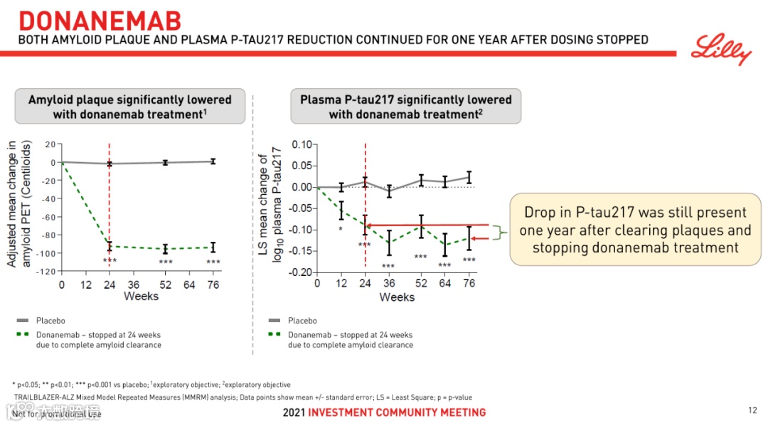 Donanemab是一款靶向β淀粉样蛋白的单克隆抗体,它在2期临床试验中达到主要终点,将早期阿尔茨海默病患者的临床进展速度延缓32%。在生物标志物研究中,donanemab不但导致淀粉样蛋白沉积的快速清除,而且显著降低患者血浆中P-tau217的水平。这是礼来开发的一个在研血液生物标志物,与淀粉样蛋白和tau蛋白病理,以及AD的诊断相关。即使在停止donanemab用药一年后,P-tau217水平仍然显著降低。FDA已经授予donanemab的BLA优先审评资格。