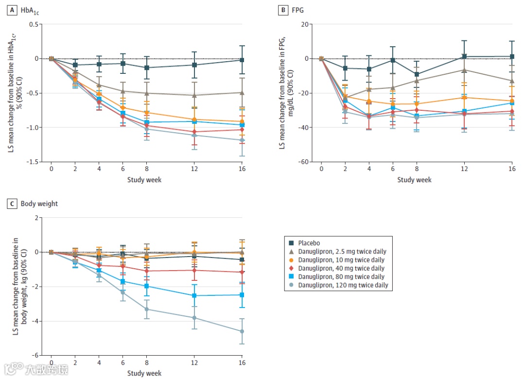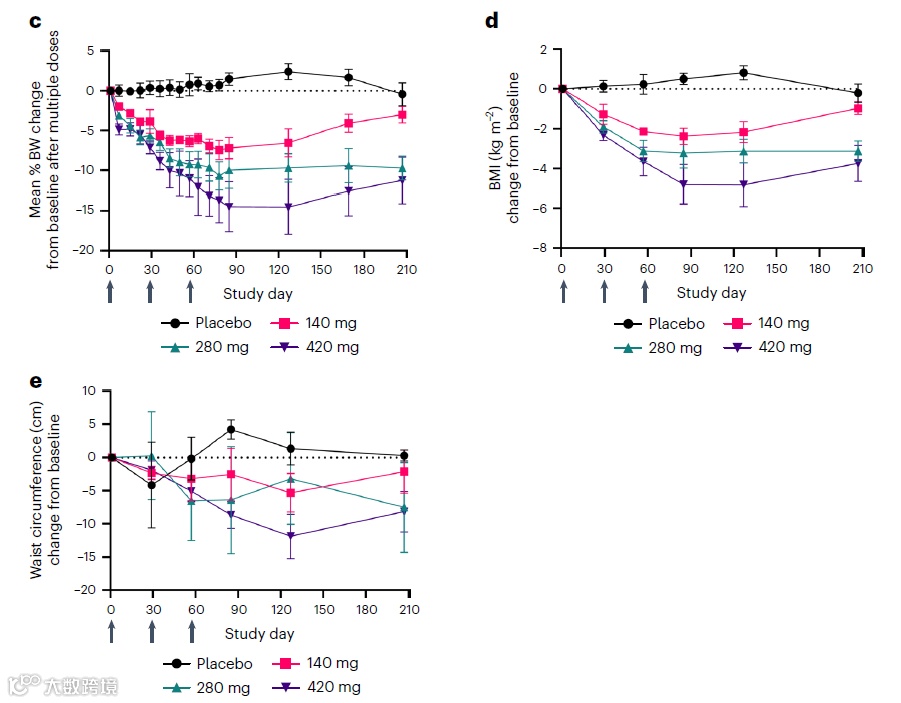 ▲在多剂量递增队列中,患者的体重,BMI和腰围均出现剂量依赖性下降(图片来源:参考资料[2])