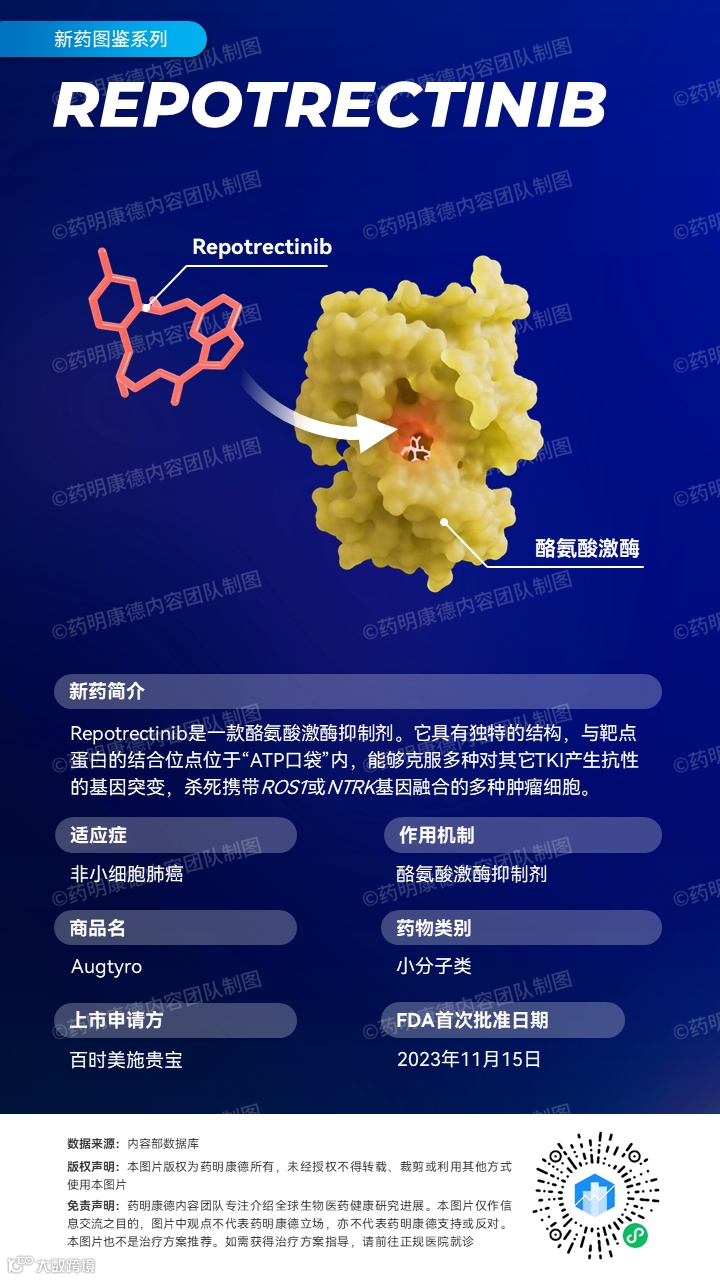 百时美施贵宝(Bristol Myers Squibb)宣布,美国FDA批准其口服酪氨酸激酶抑制剂(TKI)Augtyro(repotrectinib)用于局部晚期或转移性ROS1阳性非小细胞肺癌(NSCLC)成人患者的治疗。根据新闻稿,Augtyro是首款获批用于ROS1阳性NSCLC患者的新一代TKI疗法。