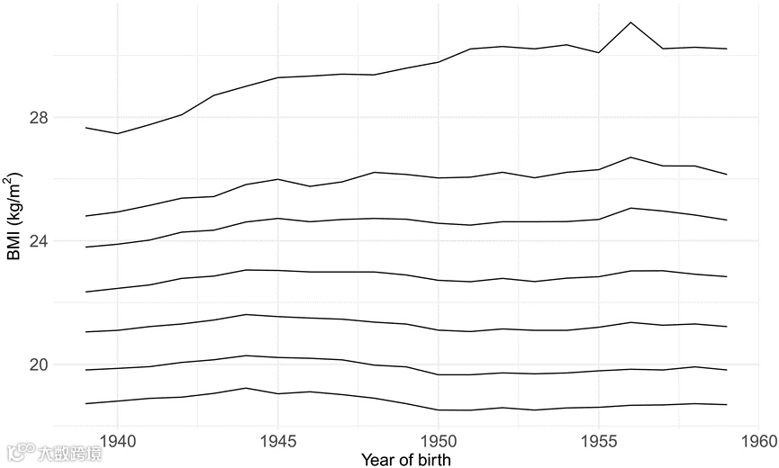 而BMI指数在前25%的那部分人群,他们的最高体重指数明显呈逐年上升的趋势,尤其是那些BMI指数较极端的人群。例如,1940年出生的应征入伍者中,BMI值处于前1%的人群的BMI值徘徊在28附近,而1950年出生的应征入伍者中,前1%人群的BMI值则超过了30。