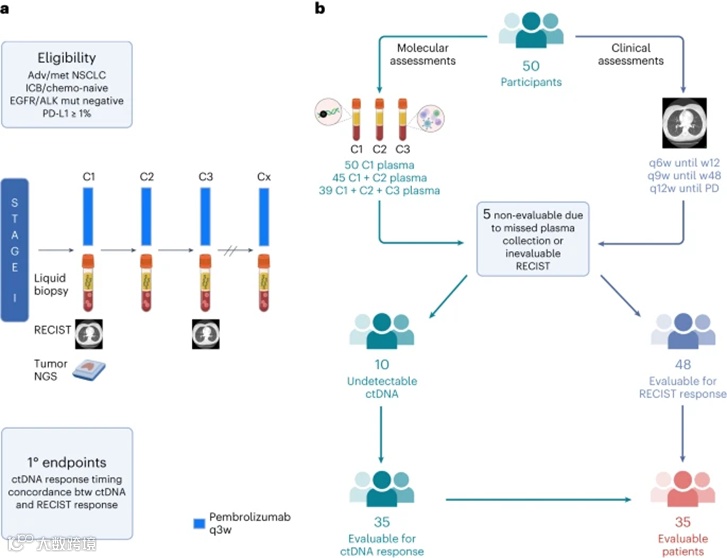 第一阶段(观察性阶段):该阶段纳入了50例接受帕博利珠单抗单药治疗的晚期/转移性NSCLC患者。研究人员通过连续的ctDNA分析,评估了这部分患者出现ctDNA分子学缓解的最佳时间点,并验证ctDNA分子学缓解与影像学缓解的一致性。