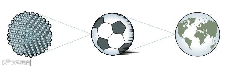 ▲量子点是一种晶体,通常由几千个原子组成。就大小而言,它与足球的关系就像足球与地球大小的关系一样。(图片来源:Johan Jarnestad/The Royal Swedish Academy of Sciences)