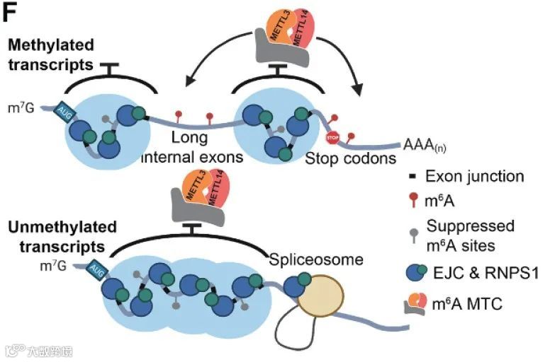 这种EJCs介导的m6A甲基化抑制机制对于维持正常的基因表达至关重要,EJCs缺失导致mRNA的普遍m6A超甲基化,进而招募更多的m6A“阅读器”,造成m6A介导的转录本不稳定。