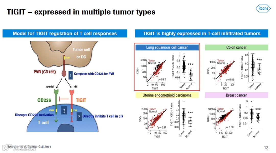 TIGIT的全称是T细胞免疫球蛋白和ITIM结构域蛋白(T cell immunoreceptor with Ig and ITIM domains)。T细胞表面表达着许多种不同的激活性受体和抑制性受体,这些受体经常两两配对,对T细胞的活性进行微调。TIGIT和激活性受体CD226是一对,它们的共同配体是PVR(CD155)。TIGIT通过与CD226竞争和PVR的结合,扰乱CD226的激活等机制,抑制T细胞的激活。它在多种癌症类型的肿瘤浸润T细胞中高度表达。