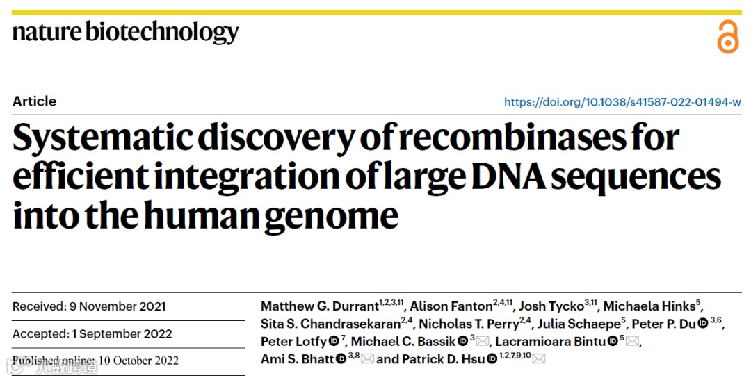 通过对人类基因组的修改,一劳永逸地治疗遗传疾病,是许多科学家的梦想。而基于CRISPR-Cas9而开发的一系列基因编辑系统的问世,让人们看到将梦想变为现实的希望。目前基于CRISPR-Cas9系统的体内基因编辑疗法已经获得概念验证,随后出现的单碱基编辑系统也已经进入临床开发阶段。然而,这些系统在人类基因组中精准插入大段DNA方面仍然具有不少局限性。近日,加州大学伯克利分校和斯坦福大学的科学家组成的研究团队,发现了一系列全新的大丝氨酸重组酶(large serine recombinases,LSR)。这些LSR可以将超过7 kb的大型DNA片段精准地插入人类基因组,为基因组工程化研究,以及创新疗法的开发提供了一整套新工具!